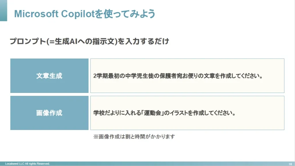 今回の研修では、教育現場における生成AIの活用方法を中心に、「Microsoft Copilot」を実際に操作しながら、プロンプトの基本設計や教員業務への具体的な活用事例をご紹介しました。