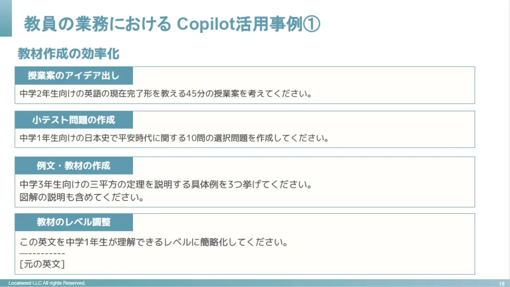 研修では、教育現場で実際に使える具体的なプロンプトの作成方法や、以下のような活用事例を共有しました。